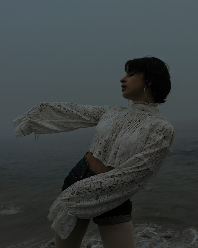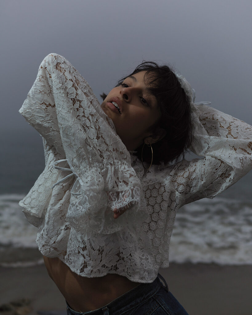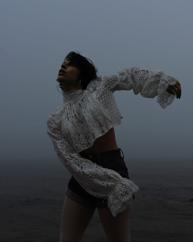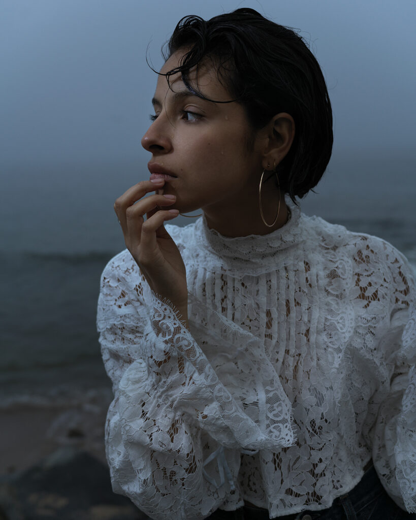 The first shoot was set for Easter Sunday at sunset. I live in Santa Monica. California where it is always sunny, but on this day, we had a rare, atmospheric low pressure with dense fog. It was very eerie and surreal, unlike the bright sunny backlit portraits we had planned for in our storyboards. We did not mind, as the music was titled “Moon Kiss,” so the dark lighting conditions were fitting for the theme, so we decided to create the low-key images at this time. The objective was to create a series of dance images shot as if Talia were dancing with the moon, with soft movement in the posing. We also planned on creating tight beauty shots that would show deep thoughtful expressions and less beauty/glamour, though her face is intrinsically glamorous. We drove down Pacific Coast Highway, scouting the perfect spot for our shoot. We found a great rock-formed jetty set up high over the sand and water. This was perfect since it allowed Talia to use the path as a runway and I was also able to set up my laptop and camera gear without getting any of it wet. Here are the specifics to our shoot: