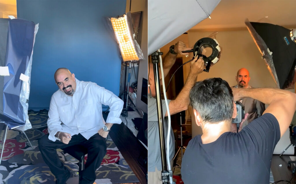 Here are some tips for those of you who have or are thinking of creating a home studio. I get asked quite often whether it is a promising idea to have, or work in a home studio environment, and my take on that is – It depends on the job and on the client. For my commercial work, new clients, or most celebrities, I often shoot in a commercial space. This opens the opportunity in creating multiple setups with varying lighting, and the subject simply just walks in on set. In my initial conversation with the client, I determined which direction I would go. There are many times when my clients are quite content shooting in my home studio. Reasons for can range from maintaining a private set, a scheduling conflict with studio rental, or simply the location is more convenient. Ultimately, they are confident in my work and trust me, which makes them comfortable and open to my suggestions. One important note to keep in mind when working from home is the overarching thought, “first impressions are one time.” Maintaining a professional and clean working environment is extremely important. The more you can streamline your environment, the better it will make for a creative space. Having amenities such as a vanity room with hair and facial products, a large body mirror, as well as an allocated changing room with a wardrobe rack is important. Just as important is having a set place for refreshments, snacks, fruits, and if the shoot runs long, an actual lunch break. When working with a makeup artist, you also need to create a comfortable space for him or her, a table for the makeup tools, and make certain you have great lighting. Open natural light is great, but many times I use a large LED lamp with silk diffusion. If you do not get this part right, it will reflect on your final shots. Also, have some seating options for your client. For the clean headshots I usually will have one posing stool without any backing, one or two decorative chairs with arm rest for the publicity shots, and a posing table, which helps for hand placement, and are good for expressive theatrical closeup shots. Theatrical shots are usually low-key lighting with strong character expressions and are quite commonly used for actors. I usually like to hint at an expressive attitude such as a confident, alluring, pensive or stern looks. Lastly, around the studio I have a couple of apple boxes with a. neutral finish, which is great for foot placement and sometimes can be used to sit your subject.
